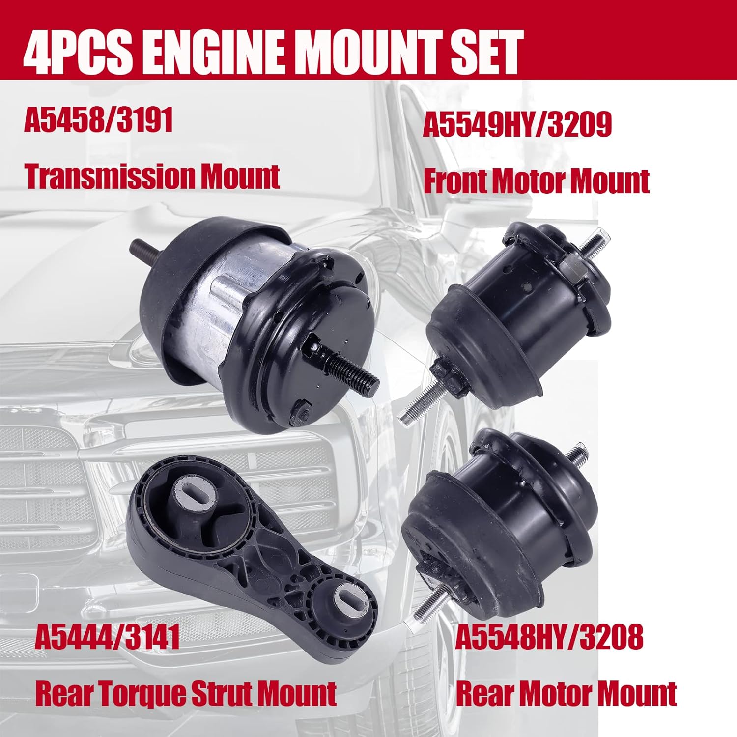| Included Components | * 1 x A5549HY / 3209 (Engine Mount - FRONT, Hydraulic) * 1 x A5548HY / 3208 (Engine Mount - REAR, Hydraulic) * 1 x A5458HY / 3191 (Engine Mount - FRONT RIGHT, Hydraulic) * 1 x A5444 / 3141 (Torque Strut Mount - FRONT) |
