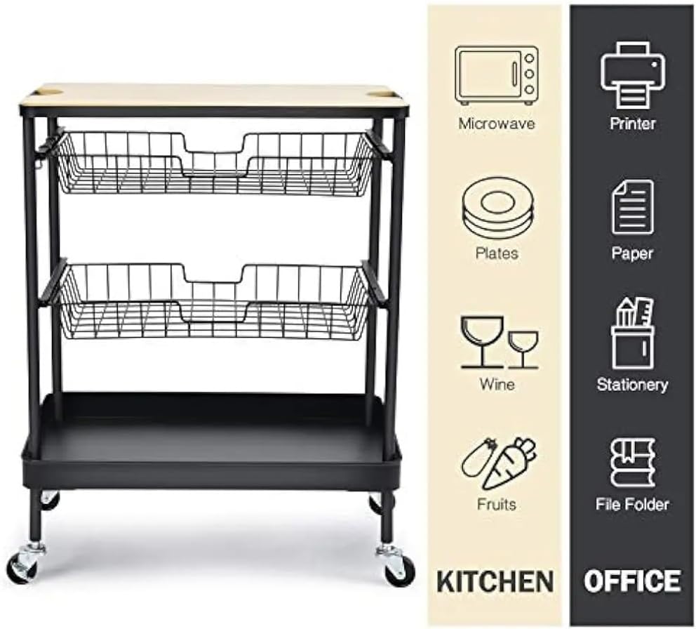 This multifunctional trolley is designed as transporting supplies in kitchen, living room, office, hotel, restaurant, or anywhere with limited storage space. It is versatile addition to any home.Featured a wood table and 3-tier storage layers and 3 hooks. The tabletop provides extra counter space for kitchen appliances or cutting board. The 2nd/3rd basket drawers can be pulled out to store.Made of steel construction,Equipped with 4 smooth omnidirectional heavy-duty wheels which 2 are lockable, utility handles for easy mobility and scratch-free floors.Instruction manual included in the package provides step by step instructions for assembly. A wonderful kitchen serving cart is completed within just a few minutes, screws and tools are provided.Overall Size: 24.0"(L) x 16.1"(W) x 30.3"(H) | Max Capacity: 110lbs | Each Capcity: Top Table(17lbs), Second & Third Basket(13lbs), Bottom Tray(17lbs)Package: 1 pcs kitchen cart (Does not include other demo goods)1. Due to light and screen differences, the color may be slightly different from the picture.2. Due to manual measurement, please allow 1-3 cm difference.3. Thank you for your understanding.assembly—just follow the instructions.
